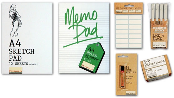 In order to sell everyday items such as labels and pens, we introduced a ‘Ryman Basics’ range using a ‘brown paper’ background. On the Ryman pad covers, we used exact representations of the paper content inside, with relevant illustrative examples demonstrating their usage. Simple, basic value ran effortlessly as a theme throughout.