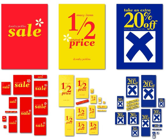 This three phase promotion for Dorothy Perkins started with a general Sale, followed by many items being sold at half the original price, then ending with a Blue Cross Sale, where an extra 20% was taken off selected lines. Elements ranged from large format posters, to swing tickets and window flashes.