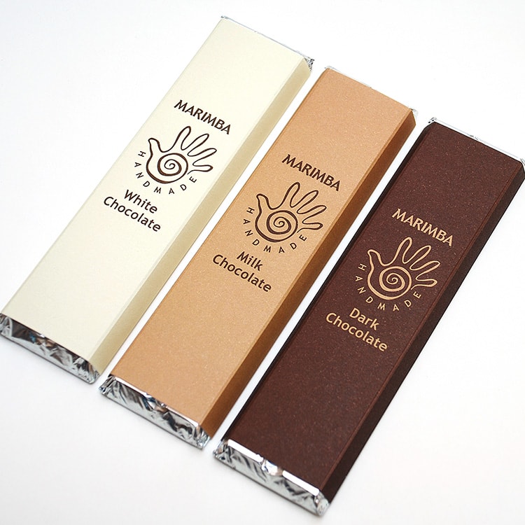 Marimba hot chocolate melt packaging design for different chocolates with a gold foil finish side view